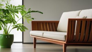a luxurious minimalistic sofa with a plant and the sofa is only half visible in the image. the sofa is in teak wood with modern style and the overall image is very aesthetically appealing